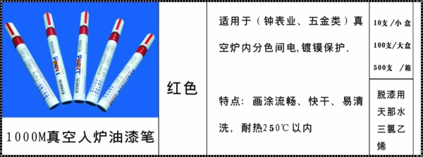 答: 一种叫真空入炉油漆笔1000M(红色)由东莞市添彩电镀间金笔制品厂与国外各公司技术人员研制而成,特别适合真空入炉间金分色保护用。 此笔均已将油墨灌到笔里,密封性好,质量更有保证。厂商拿到货后可直接画油,新人容易上手,对于电镀工件画涂操作简单,更省力省料,更快捷方便,画油质量更标准。能达到速度与质量的双赢。此间金笔用于五金、钟表、门锁、真金银、仿金银首饰等分色电镀。 请问这是你们需要的吗↓ 真空入炉非此笔不可,因为专业,所以值得信赖。欢迎各厂商来电质询,可免费定样板试用